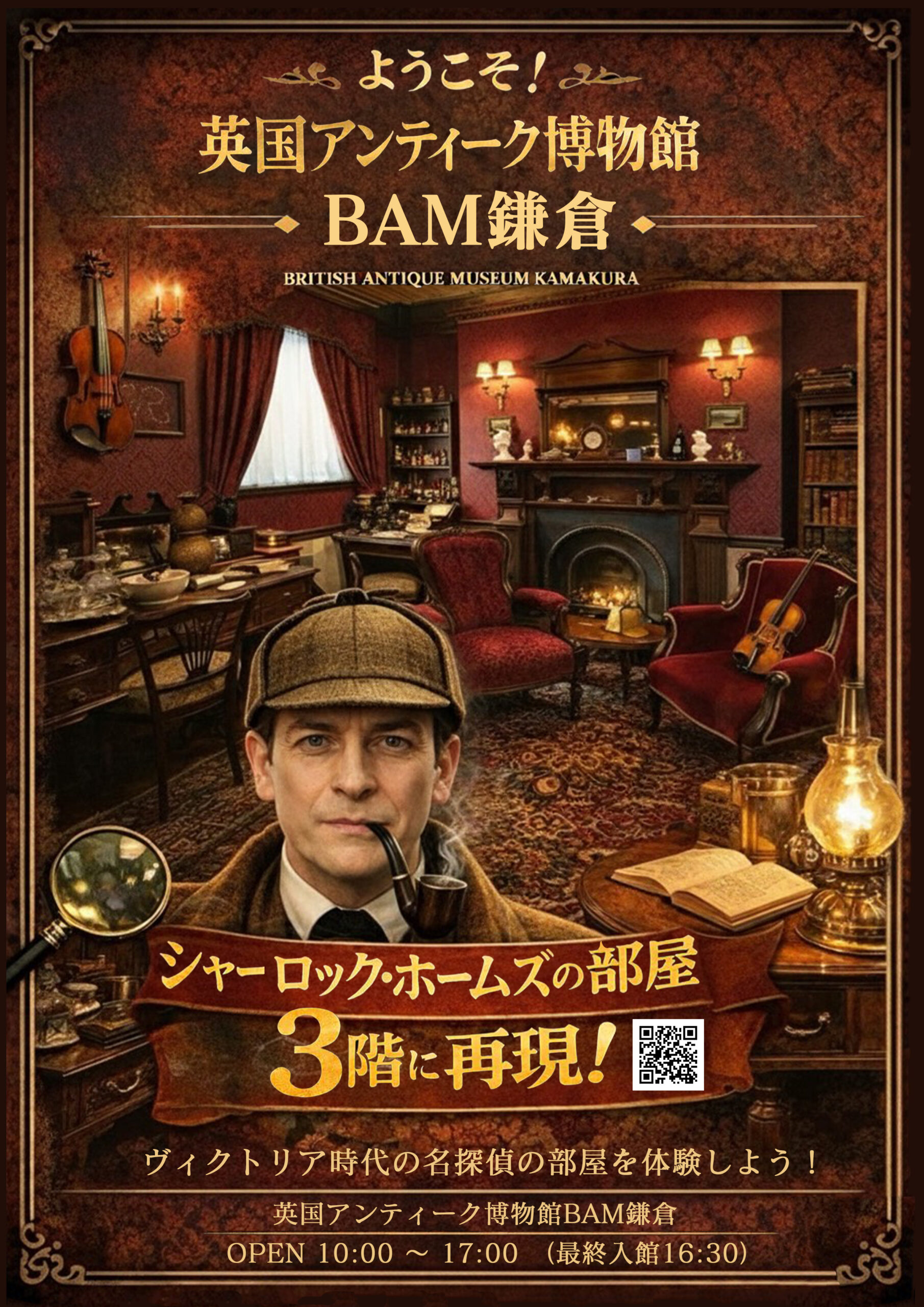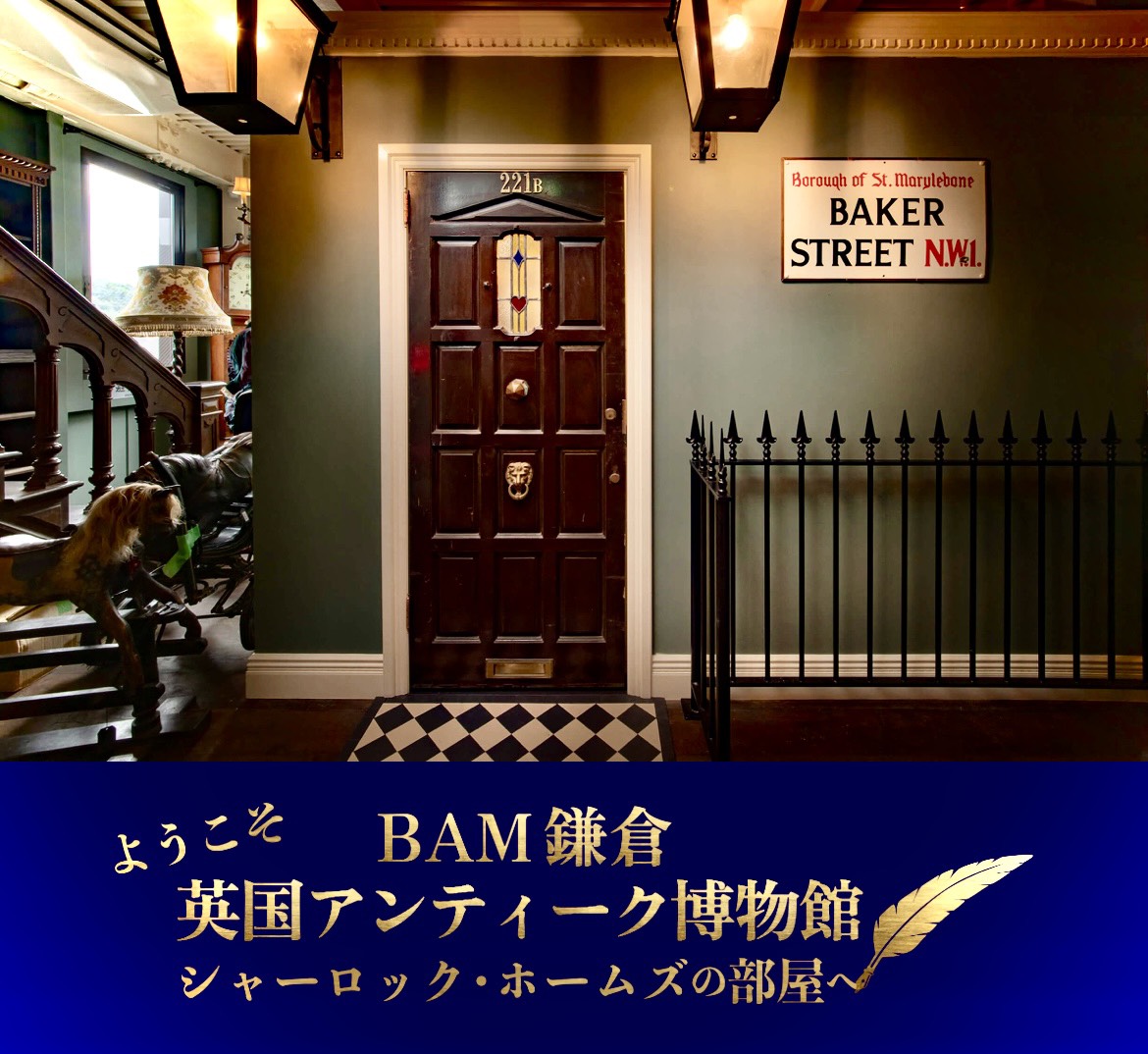 BAM鎌倉のウエブサイトにご訪問して頂きありがとうございます。私が初めて訪れたイギリスで衝撃を受けたのは、古き良きアンティークを愛し、大切に引き継ぐ文化でした。それから英国の各地を巡る機会に恵まれ、アンティークへの愛情をひしひしと感じ、日本人が忘れつつある古いモノを継承する大切さを思い知らされ、ますますのめり込みました。 こうした素晴らしき文化的価値のあるコレクションを皆様にご紹介したいと考え、歴史ある鎌倉の鶴岡八幡宮の参道沿いに、『英国アンティーク博物館BAM鎌倉』を開設しました。 当館では、英国中から集めたヴィクトリア時代の貴重なアンティークを用いて『シャーロック・ホームズの部屋』を再現しています。鎌倉の地で、一人でも多くの方が本物の英国アンティークと出会い、モノを引き継ぐ素晴らしさを感じとって頂けたら幸いです。