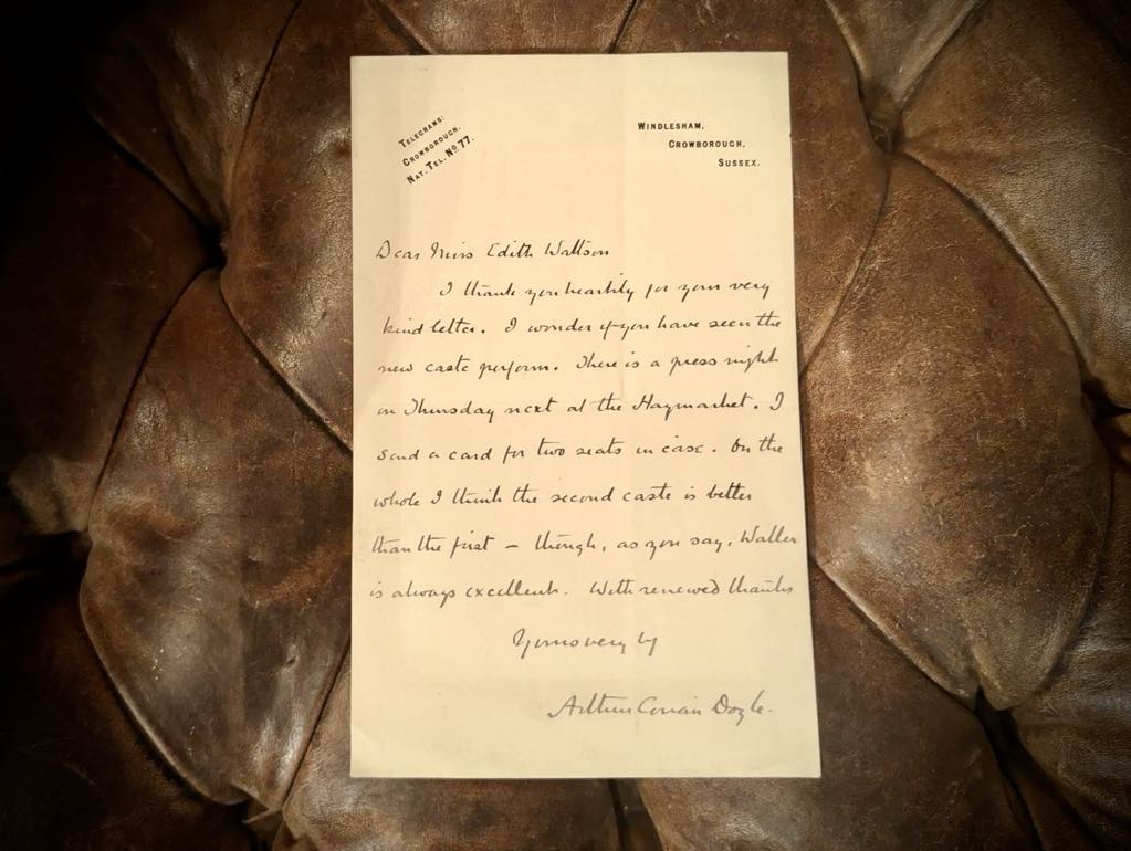 アーサー・コナン・ドイル直筆の書簡(1909年)劇場への招待を綴った一通。作家としての顔と、社交的な一面がにじむ貴重な記録。