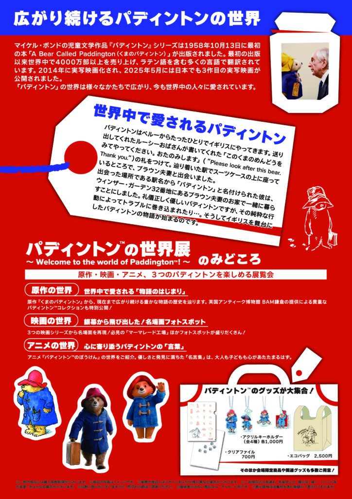 マイケル・ボンドの児童文学作品『パディントン』シリーズは、1958年に最初の本が刊行されて以来、4000万部以上を売り上げ、世界中の人々に愛されています。本展では、「原作の世界」、「映画の世界」、「アニメーションの世界」、という3つの「パディントン」の世界をご紹介!子供から大人まで楽しめる展覧会です。