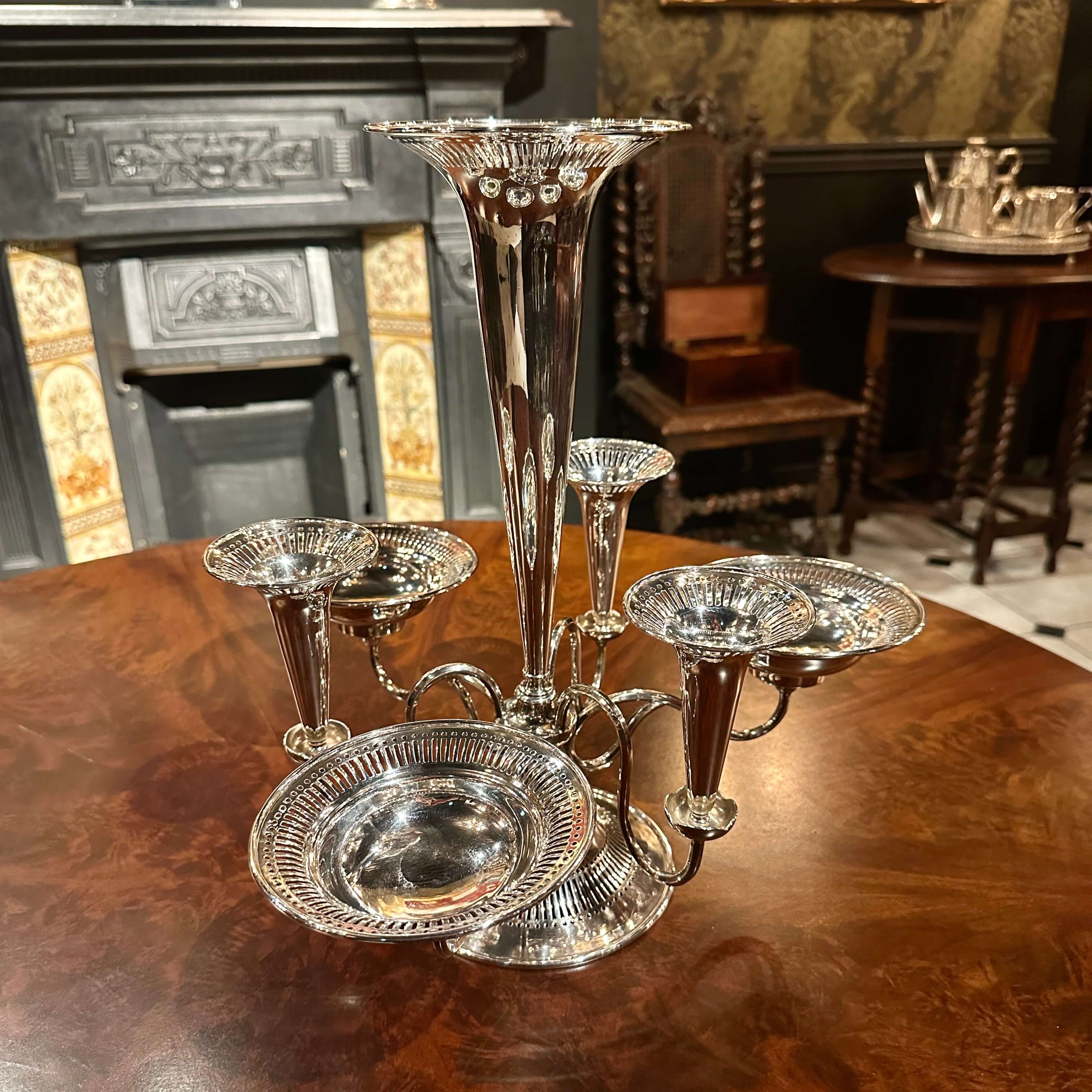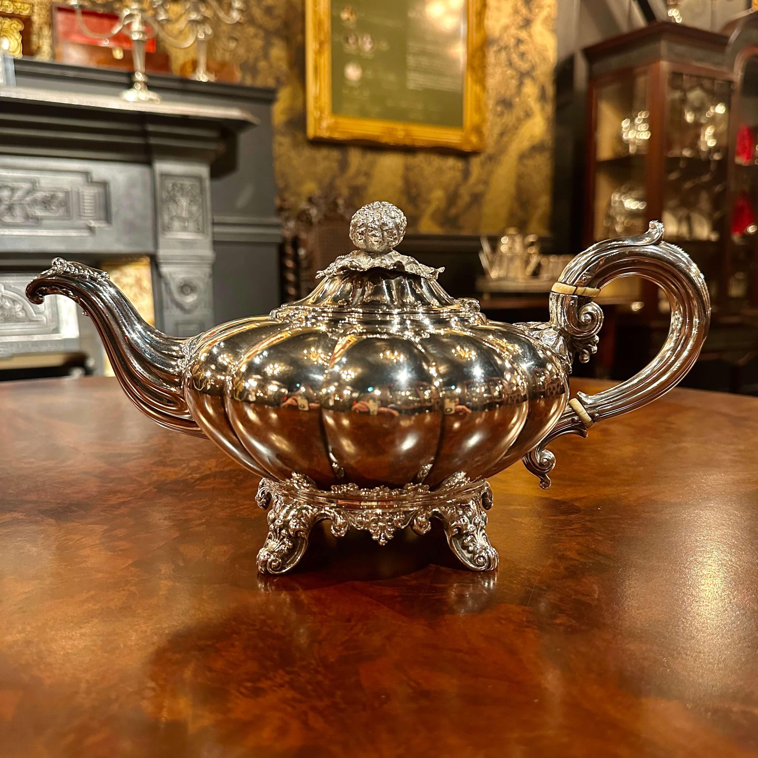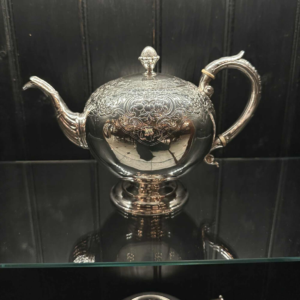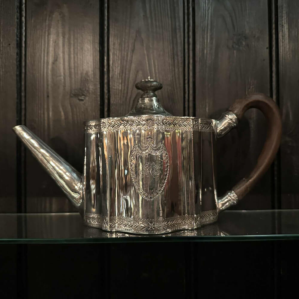 ジョージアン時代は、英国の銀器文化が花開いた時代です。BAMでは、当時のティータイムや晩餐を彩ったシルバーを展示、ジョージアンからヴィクトリアンへと移り変わるポットの意匠の変遷を辿ることができます。また、湯を温めるためのティーアーンやスピリッツケトル、茶葉を保管するティーキャディは、紅茶文化の普及を象徴する品々です。テーブルを華やかに飾るイパーンや燭台は、室内の雰囲気を格調高く演出しました。また、温かい菓子を供するためのビスケットウォーマーやアフタヌーンティー用のスタンドも展示され多彩な形をご覧いただけます。